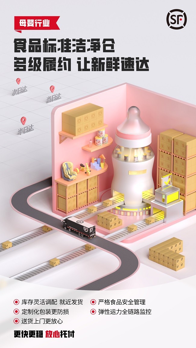 母婴产品的商家存在全渠道经营下库存分散、资金压力大、服务水平不一等问题。为此,顺丰打造全链路数智物流解决方案,通过“B&C仓配+一盘货智能履约”的模式,实现线上订单智能推单、快递产品智能选择、订单智能拆合,有效平衡成本与速度,降低企业库存,提高资金周转率。