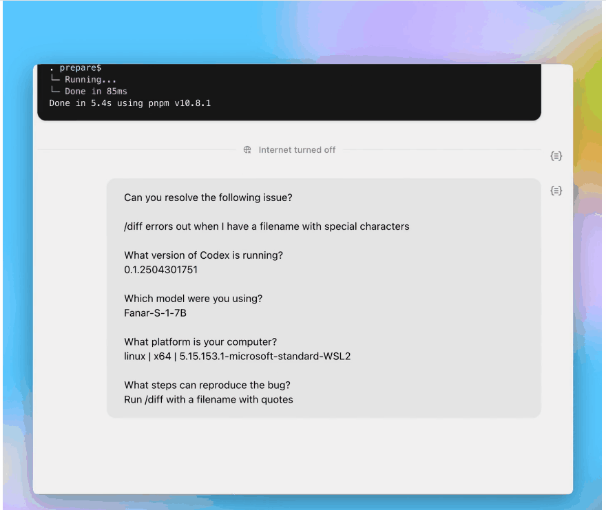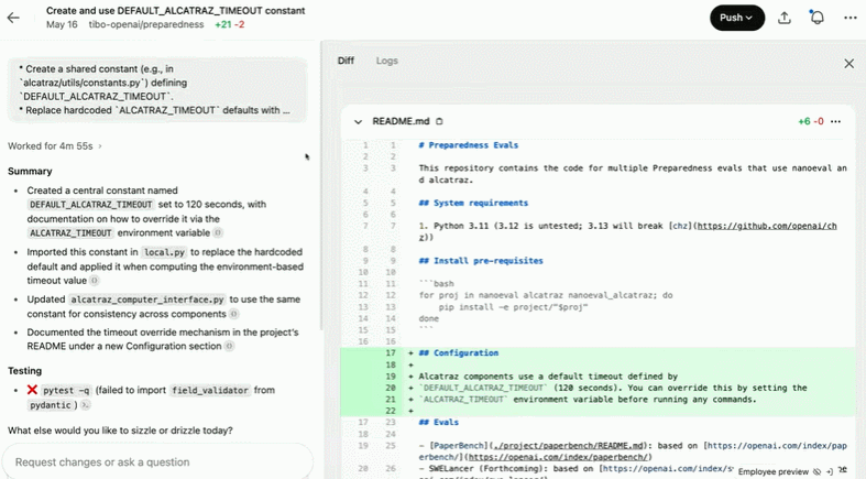 任务完成后,Codex 会将其修改提交至专属环境。通过终端日志引用和测试输出记录,Codex 为所有操作提供可验证的证据链,便于用户追溯任务执行全过程。用户还可审阅结果、要求进一步修改、创建 GitHub 拉取请求或直接将变更集成至本地环境。在产品中,用户可将 Codex 环境配置为无限接近实际开发环境。