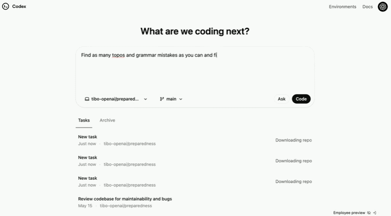 Codex 是一个云端软件工程智能体,可以并行处理多项任务,包括编写功能、解答代码库相关问题、修复 bug 以及提交拉取请求以供审核等。并且,每个任务都在其专属的云沙盒环境中运行,并预加载代码库。