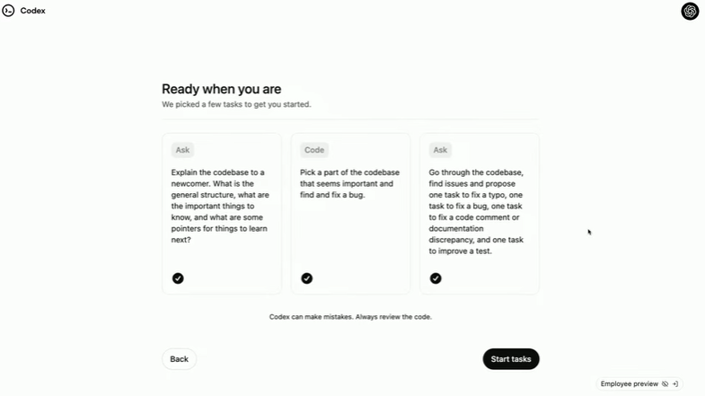 此外,OpenAI 表示,Codex 仍处于早期开发阶段。作为研究预览版,它目前尚不具备某些功能,例如:前端工作所需的图像输入支持,在 Codex 运行过程中实时调整智能体的能力。