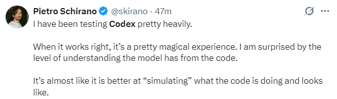 还有人现身说法,在经过对 Codex 大量测试后发现,当它正常运作时,几乎更擅长「模拟」代码正在做什么以及看起来是什么样子。