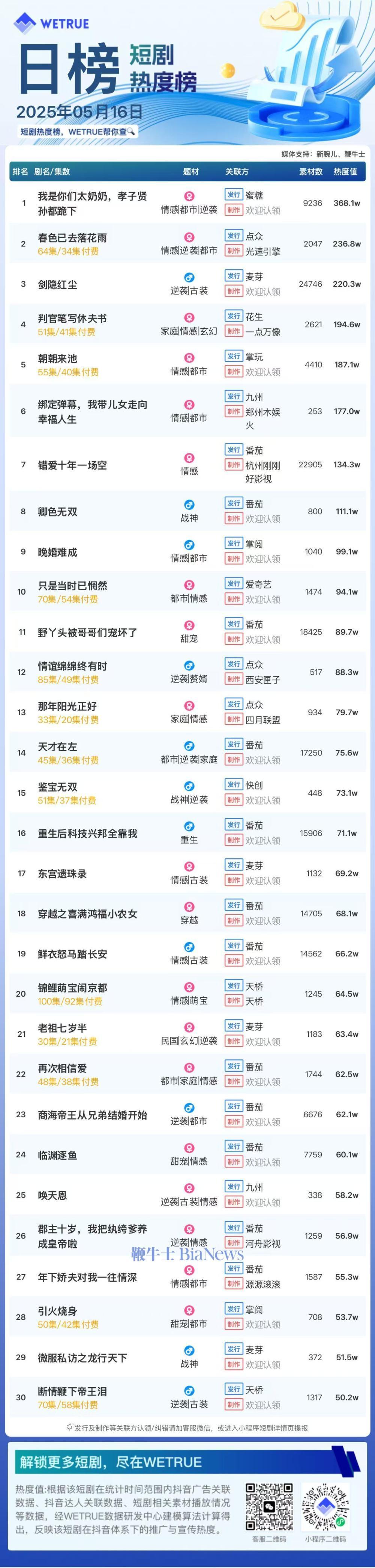 1、本日榜为WETRUE短剧数据公司提供,新腕儿和鞭牛士提供联合支持。
