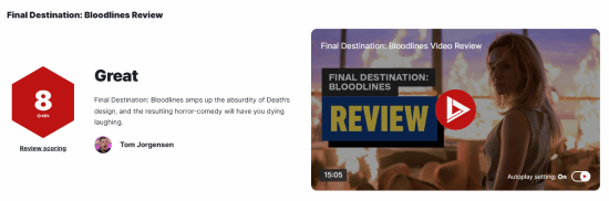 IGN为《死神来了6:血脉诅咒》打出了8分的成绩,称其“放大了死亡设计的荒谬性,由此产生的恐怖喜剧会让人笑死。”