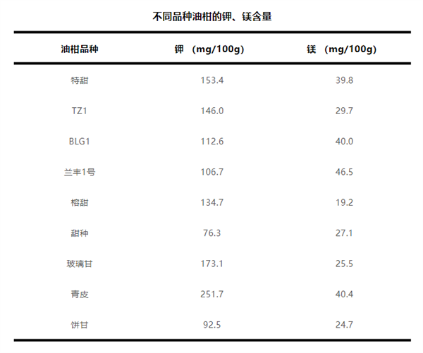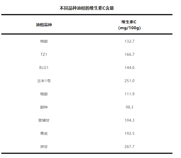 结果显示:这 9 个品种中,维生素 C 含量最低的是甜种,含量为 98.3mg/100g;最高的是饼甘,含量为 267.7mg/100g,这含量是橙子的近 8 倍呢。