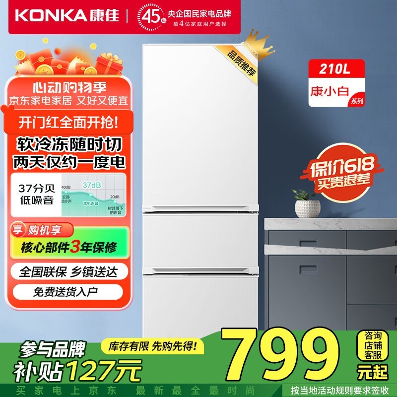 康佳小白冰箱BCD-210GB3S直冷三门节能省电799元