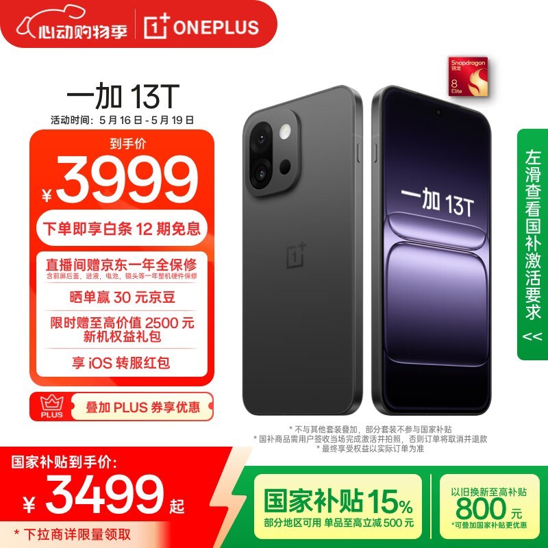 一加13T 5G手机云墨黑限时特惠3499元