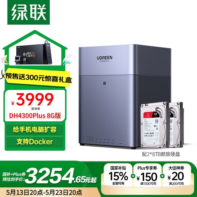 绿联DH4300Plus NAS限时特惠3234元
