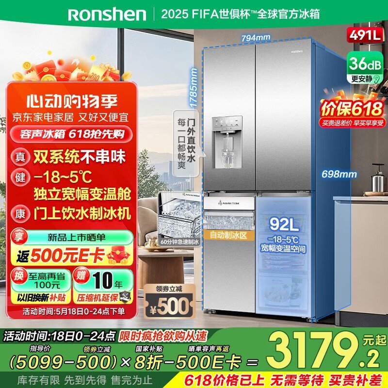 容声491升电冰箱特惠,双系统制冰风冷仅需4599元