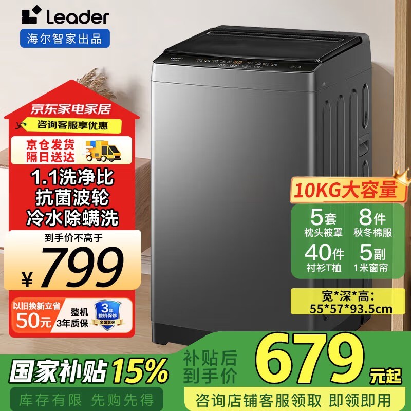 海尔智家洗衣机全自动波轮10公斤抗菌除螨洗脱一体机