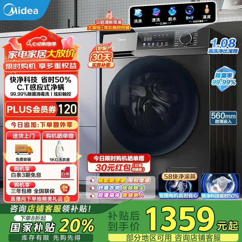 美的滚筒洗衣机MG100V58WT限时特惠1399元