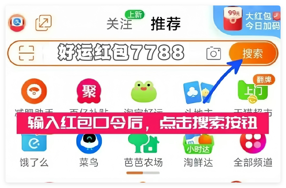 2025年淘宝天猫618活动攻略:在活动时间内,每天一定要搜索红包领取口令【 好运红包7788 】每天都可以领取一次在失效前可叠加使用。下次再领取,只需要点击搜索框,找到历史搜索记录中的红包领取口令【 好运红包7788 】就可以再次领取。