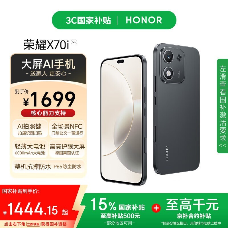 荣耀X70i 5G手机12GB+256GB绒黑色,活动价1599元