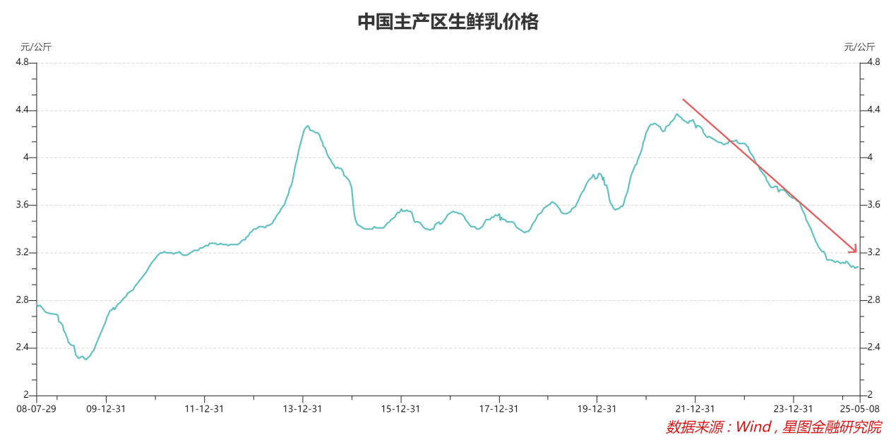 不过,2024年产能去化终于进入实质阶段。2024年全国牛奶产量同比下降2.8%至4079万吨,这是自2017年以来首次年度负增长。此外,我国主产区生鲜乳均价已跌破3.1元/公斤,较2021年高点下滑近30%,价格压力直接传导至生产端,奶牛存栏量快速下降。以山东省为例,2023和2024年奶牛存栏量分别同步下降4.7%和20%,淘汰速度明显加快。全国层面数据更新至2022年,但近两年产能去化的趋势应该是一致的。