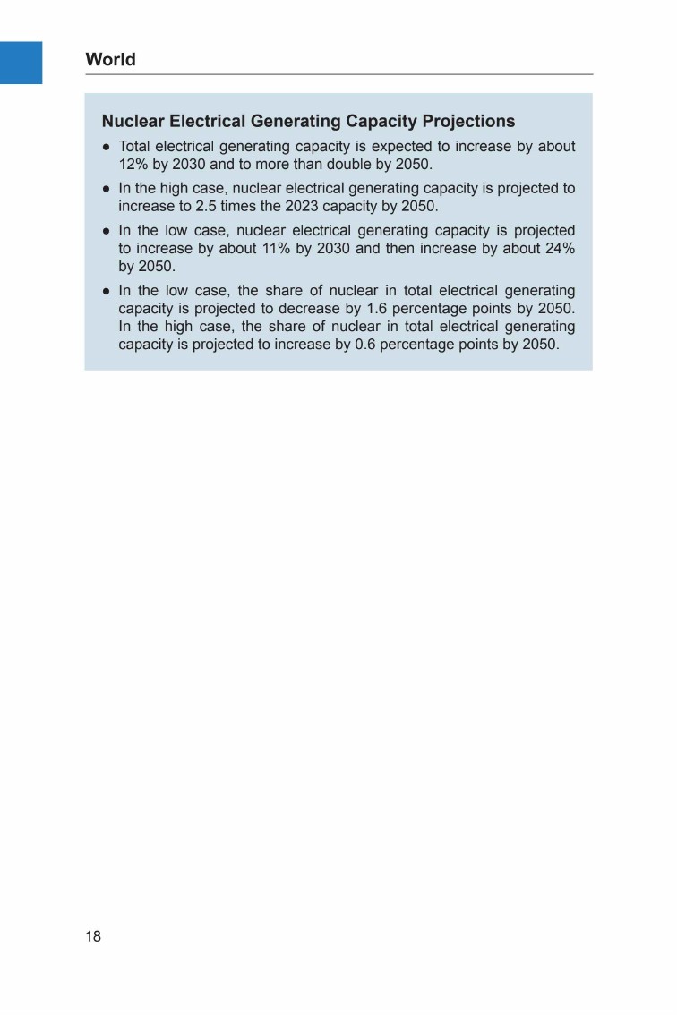 相对于2023年底全球372吉瓦(电功率)的核电运行容量,低值情景预测2050年将增长约40%,达到514吉瓦(电功率)。高值情景则预计全球核电运行容量将增长至当前容量的2.5倍,2050年达到950吉瓦(电功率)。预测还考虑了功率提升因素。预计小型模块化反应堆(SMRs)在高值情景中将占2050年新增容量的24%,在低值情景中占6%。