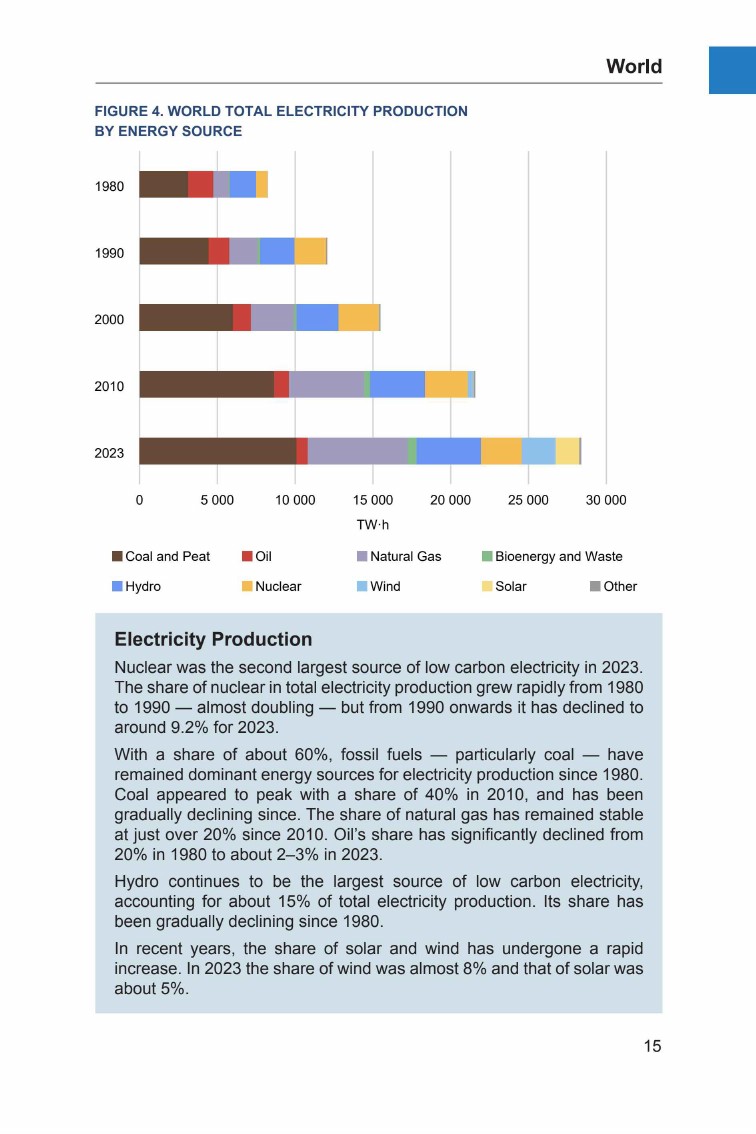 水电是最大的低碳电力来源,核电位居第二。2023年核电占全球发电量的9.2%。由于投资不足,过去30-40年水电和核电的份额逐渐下降。近年来风能和太阳能的使用增加,2023年两者合计占比达到13%。