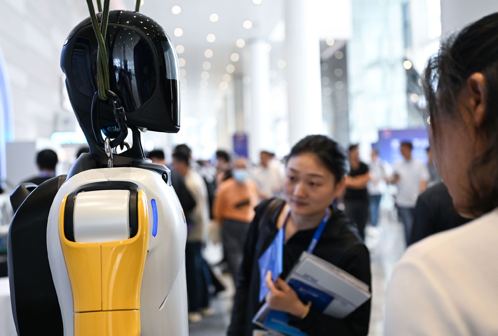 5月16日,观众在光博会上参观人形机器人。当日,第二十届“中国光谷”国际光电子博览会在武汉中国光谷科技会展中心开幕。本届光博会以“光联万物,智引未来”为主题,来自光电子领域国内外多家知名企业参展。展会设置激光技术与应用、光学与精密光学、“光+机器人”等展区,多角度展现“光+智能应用”的产业热点。