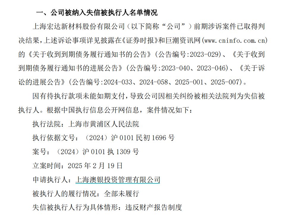 该公司在公告中称,因有待执行款项未能如期支付,导致公司因相关纠纷被相关法院列为失信被执行人。根据中国执行信息公开网信息,案件执行法院为上海市黄浦区人民法院,执行依据文号为(2024)沪0101民初1696号,案号为(2024)沪0101执1309号,立案时间为2025年2月19日,申请执行人为上海澳银投资管理有限公司。