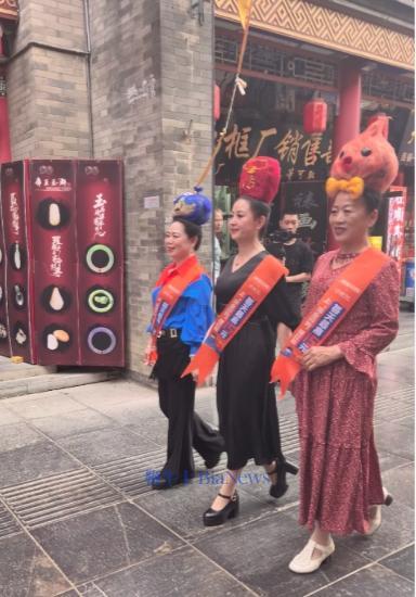 有阿姨穿着淘宝闪购领红包,每天至高15元条幅走秀。