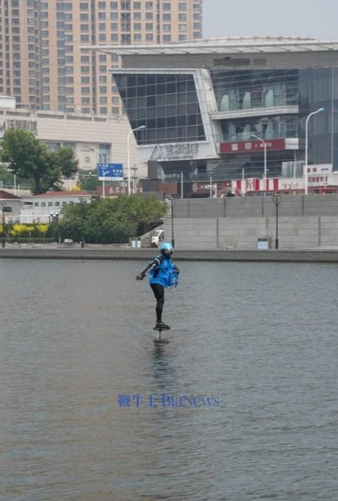 有疑似饿了么骑手用无动力水翼板送外卖。