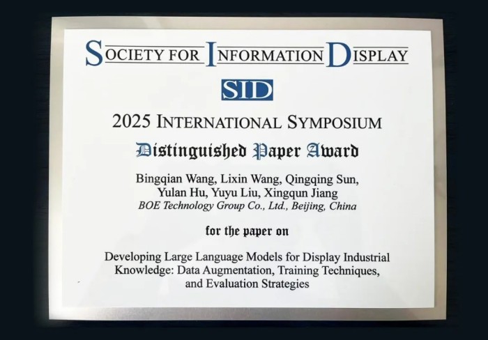 5月17日,国际显示周 2025期间,BOE(京东方)显示工业大模型最新研究成果入选“杰出论文”(Distinguished Paper Award)。这是对BOE在显示工业大模型研发方面的卓越成就,以及在提升显示知识问答效果方面的卓越表现的高度肯定。