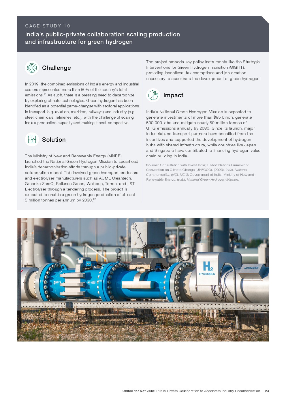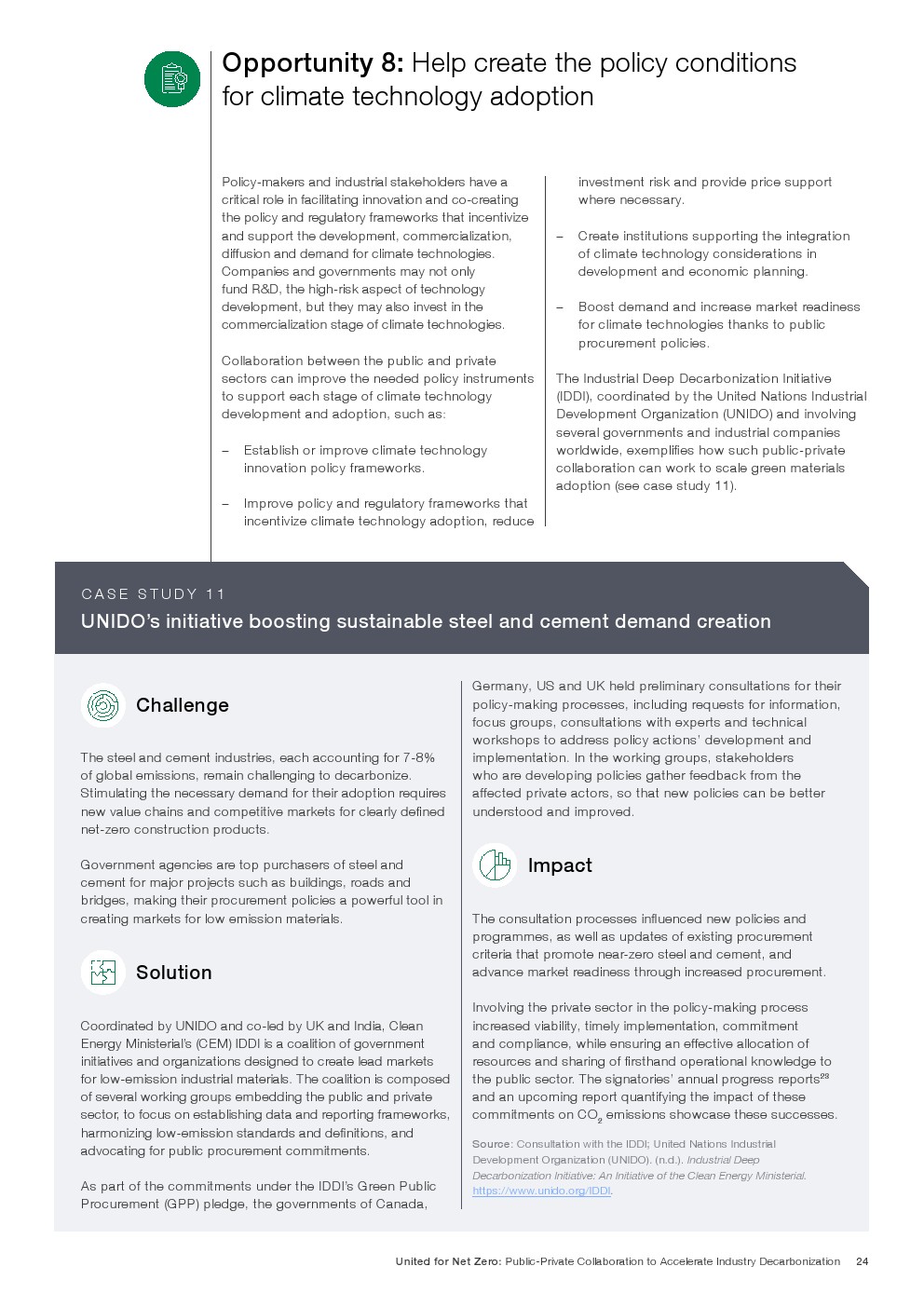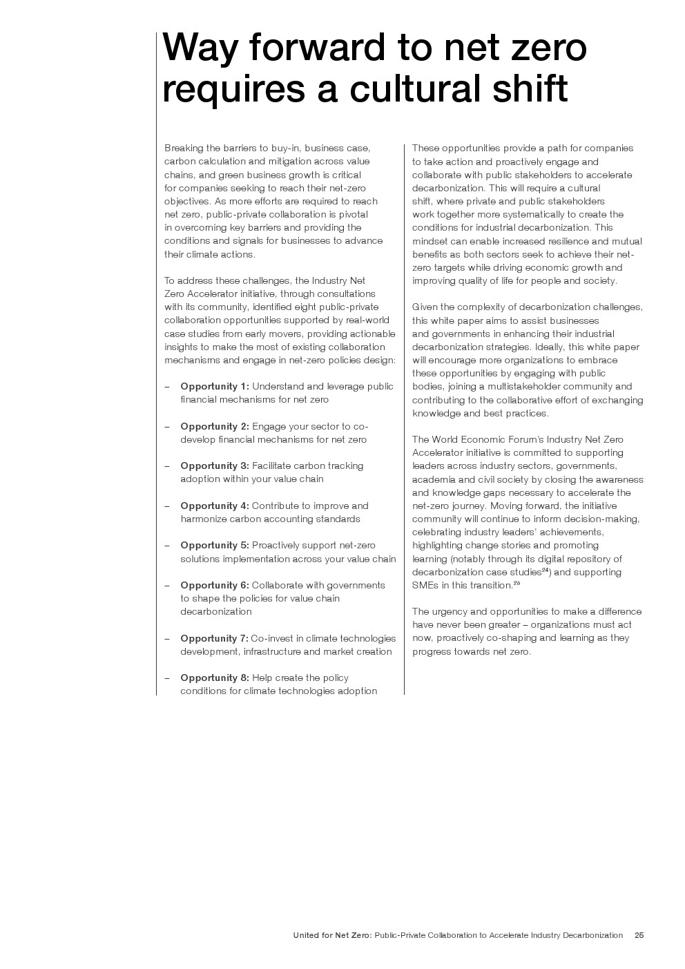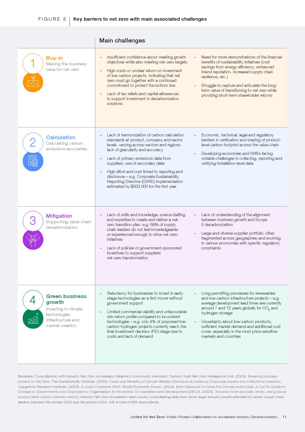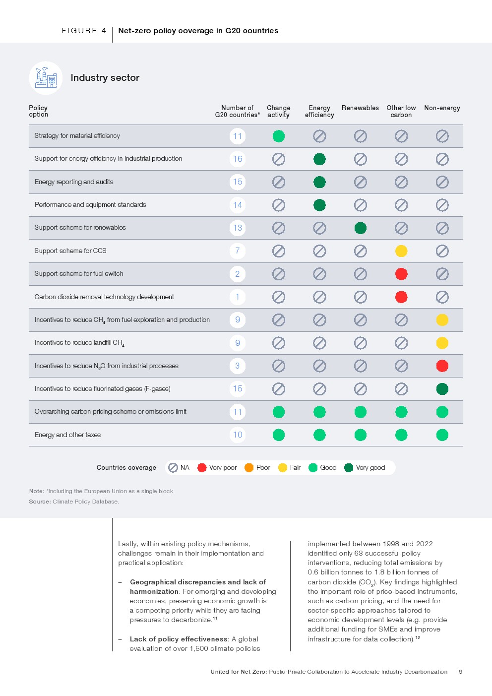 高昂的前期成本、技术限制、监管不确定性、分散的制约因素、熟练劳动力短缺、基础设施不足、融资渠道有限以及对变革的抵触等挑战,凸显了公私合作的必要性。企业需要政府提供适宜的条件,以实现大规模变革。同时,政府也需要企业协助制定产业政策,以消除更快取得进展的障碍。通过携手合作,政府可以提供量身定制的政策框架和激励措施,而私营企业则可以推动创新并确保落实。如何将这种合作付诸实践仍有待明确。