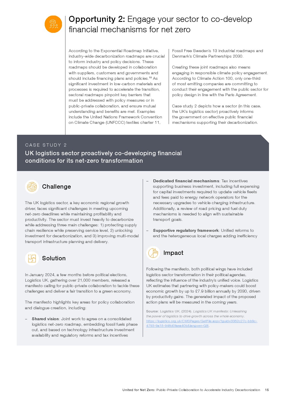 通过为战略层面的决策提供信息并构建私营部门和公共部门利益相关者之间的对话,该框架为企业寻求参与公私合作以加速脱碳进程提供了一条实用的路线图。