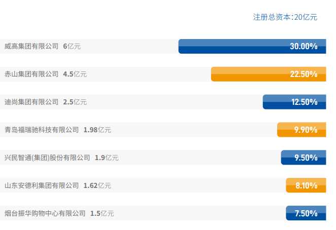 截至2024年末,蓝海银行的注册资本为20亿元,股东共7户。其中威高集团有限公司持有公司30%股份,赤山集团有限公司持有公司22%股份,迪尚集团有限公司持有公司12.5%股份。