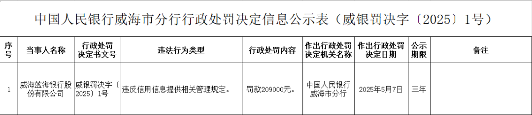 行政处罚信息显示,威海蓝海银行股份有限公司因违反信用信息提供相关管理规定,被中国人民银行威海市分行处以罚款20.9万元。