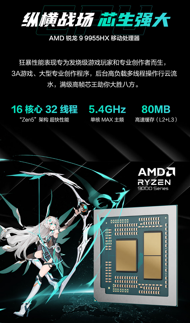 天选6 Pro锐龙版至高可选AMD锐龙9 9955HX处理器,“Zen 5“架构16核32线程,4nm工艺打造能效表现卓越,单多核性能提升显著,单核Max主频可达5.4GHz,集成有80MB高速缓存,《无畏契约》《CS2》《DOTA 2》等热门竞技网游轻松驾驭,游戏low帧表现超稳。另有锐龙9 8940HX处理器可选,同样16大核32线程并集成有80MB高速缓存,单核Max主频5.3GHz,实力不容小觑。