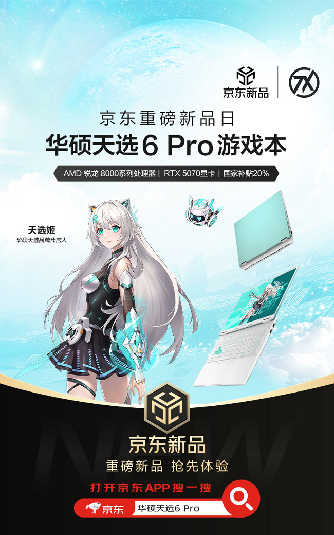 京东重磅新品来袭,潮玩新次元游戏本华硕天选6 Pro锐龙版首发热销中,搭载全新RTX 5070笔记本电脑GPU,至高配备AMD锐龙9 9955HX 16大核处理器,以“颜值、性能、续航、体验”实现“全方位Pro级”进化。打开京东APP来新品频道,买华硕天选6 Pro新品享国家补贴20% #京东新品 #京东重磅新品日,6999元起解锁高性价比电竞体验。