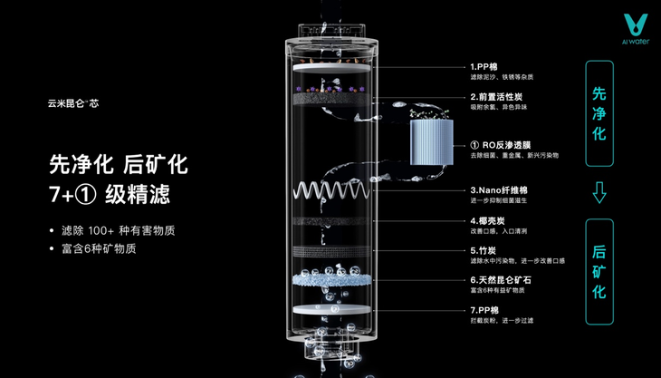 云米昆仑芯是云米昆仑4矿泉净水器的核心部件,采用7+①级精滤:PP 棉滤除泥沙、铁锈等杂质;前置活性炭吸附余氯、异色异味;RO 反渗透膜去除细菌、重金属、新兴污染物等;Nano 纤维棉进一步抑制细菌滋生;椰壳炭与竹炭滤除污染物,改善口感;天然昆仑矿石富含 6 种有益矿物质,末级 PP 棉拦截炭粉进一步过滤。