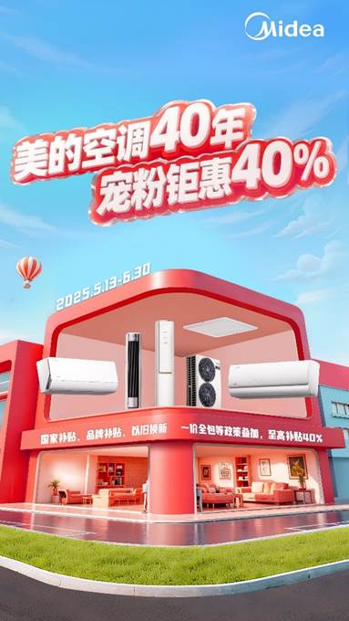 值此美的空调40周年之际,为感恩回馈广大消费者40年来的支持与厚爱,本次618大促特别推出“美的空调40年,宠粉钜惠40%”活动。5月13日至6月30日期间,消费者通过主流电商平台搜索"美的空调"进入品牌官方旗舰店选购产品,可享超值折扣、现金补贴、大促惊喜券至高可减500元等,更有换新补贴、0 元安装服务、整机超长包修等多重福利,多平台优惠政策叠加至高40%,让消费者能以更实惠的价格购入美的空调。