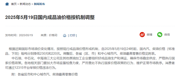 快科技5月19日消息,据国家发改委网站,新一轮成品油调价窗口将于今天24时开启,国内汽、柴油零售限价每吨将分别下调230元、220元。