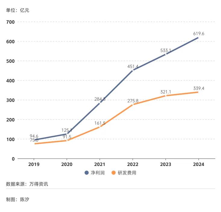 大量的研发投入是许多行业高质量发展的最重要保障,图1是2019年以来锂电池行业的净利润总额和研发费用总额。2019年到2024年,净利润总额年复合增长率为45.6%,研发费用年复合增长率为35.3%。