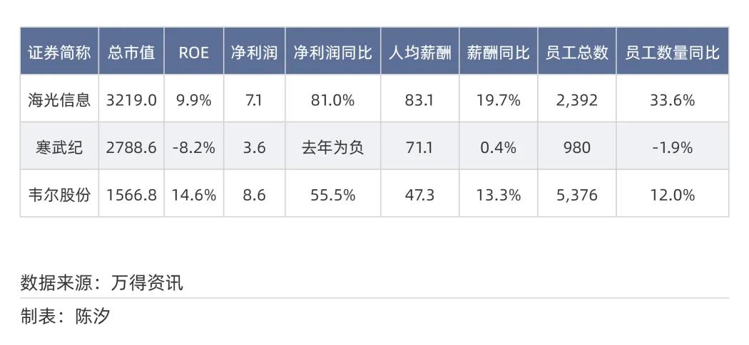 海光信息2024年人均薪酬同比增长19.7%,员工人数同比增长33.6%;寒武纪2024年薪酬涨幅为0.4%,员工人数同比下降1.9%;韦尔股份2024年薪酬增长了13.3%,员工人数上升了12%。