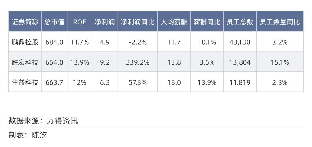 鹏鼎控股2024年薪酬涨幅为10.1%,员工人数增长了3.2%;胜宏科技2024年薪酬涨幅为8.6%,员工人数增长了15.1%;生益科技2024年薪酬涨幅为13.9%,员工人数增长了2.3%。