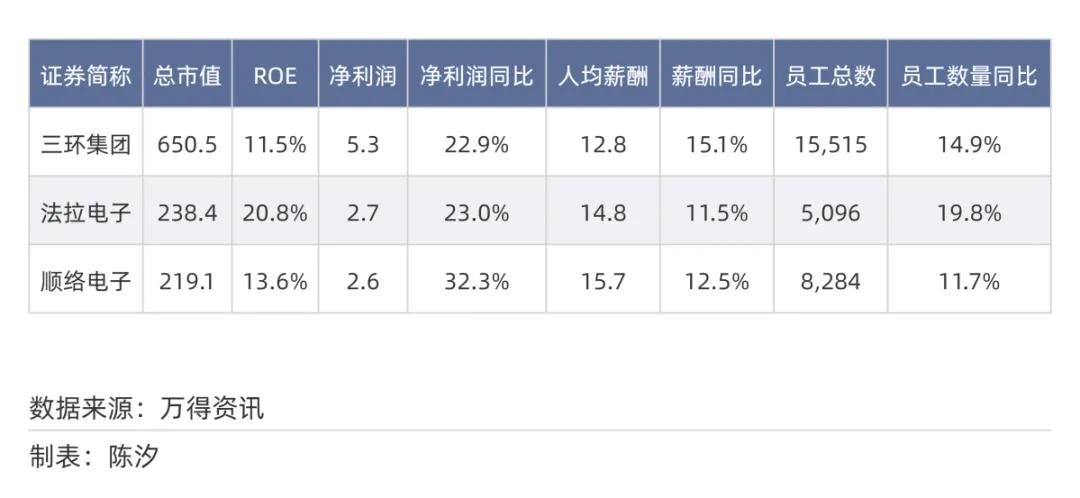 表20: 被动电子元件行业市值前三名的净利润、人均薪酬等情况