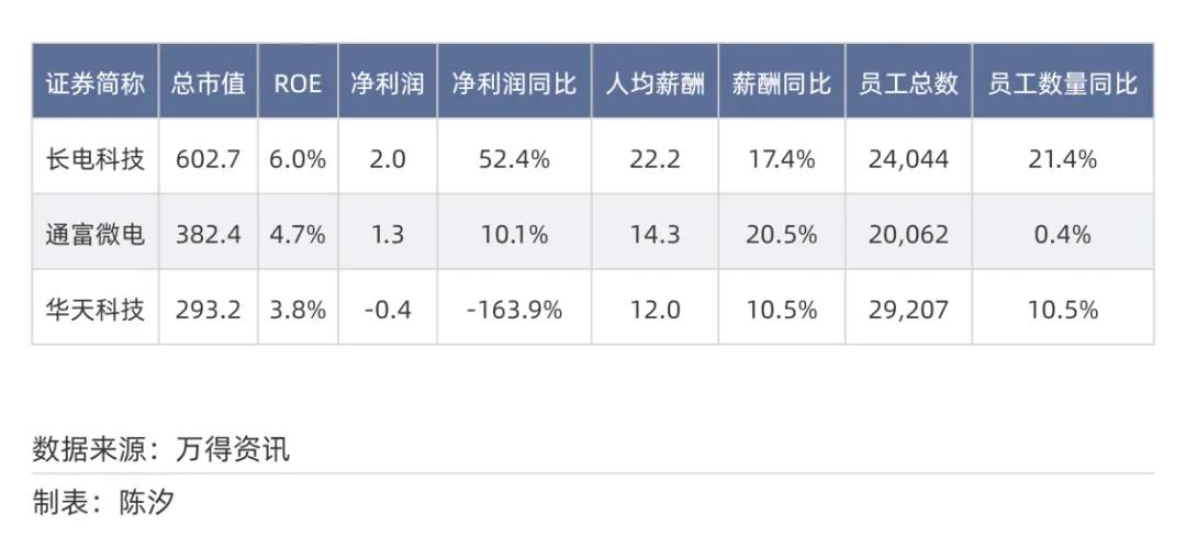 长电科技2024年薪酬涨幅为17.4%,员工人数增长了21.4%;通富微电2024年薪酬涨幅为20.5%,员工人数增长了0.4%;华天科技2024年薪酬涨幅为10.5%,员工人数增长了10.5%。三家公司的人均薪酬都显著增长。