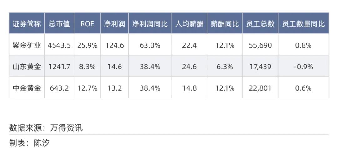 表18: 贵金属行业市值前三名的净利润、人均薪酬等情况
