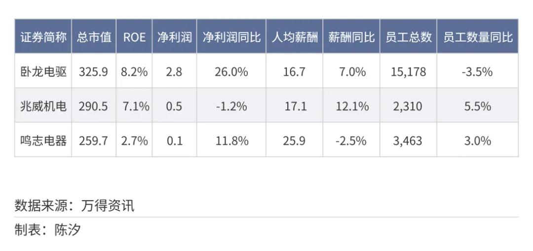 表4: 电机行业市值前三名的净利润、人均薪酬等情况