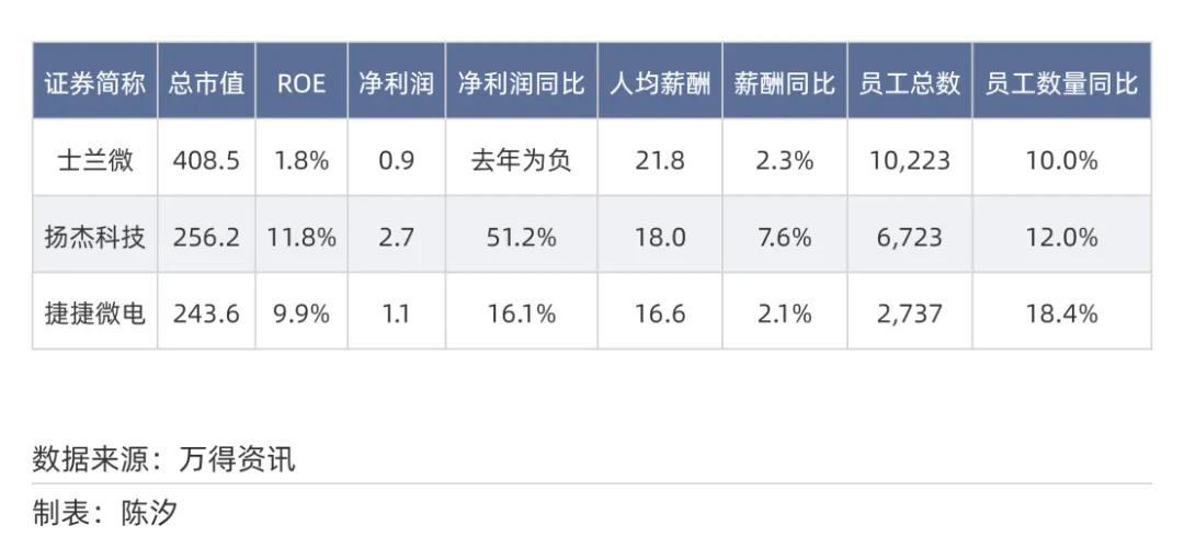 士兰微2024年人均薪酬涨幅为2.3%,员工人数增长了10%;扬杰股份2024年薪酬涨幅为7.6%,员工人数增长了12%;捷捷微电2024年薪酬涨幅为2.1%,员工人数增长了18.4%。