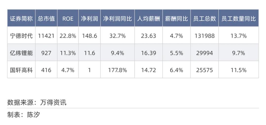 表2: 锂电池行业市值前三名的净利润、人均薪酬等情况