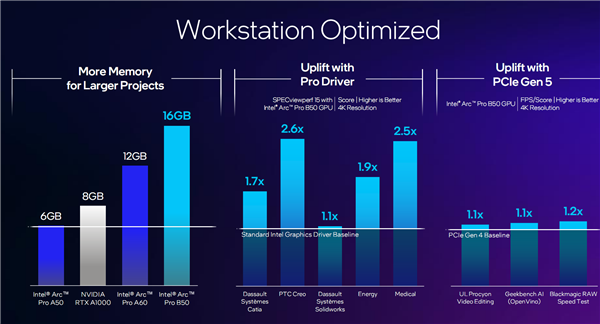要知道,专业显卡对可靠性、稳定性、兼容性的要求远超游戏显卡,对于初出茅庐的Intel锐炫显卡来说更是难上加难。