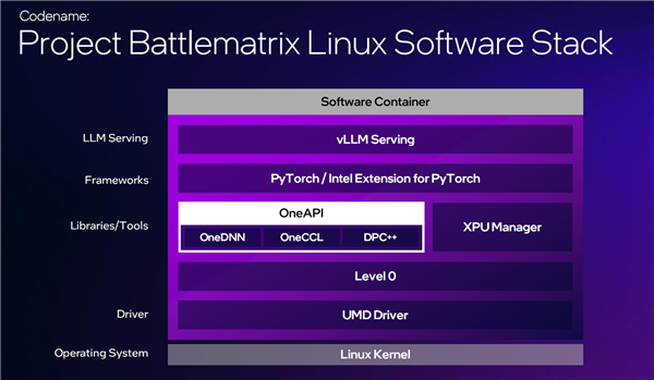 软件层面,Intel提供了基于oneAPI的全套优化,包括大模型优化的Linux软件堆栈、全栈验证,而且会阶段性地更新功能特性。