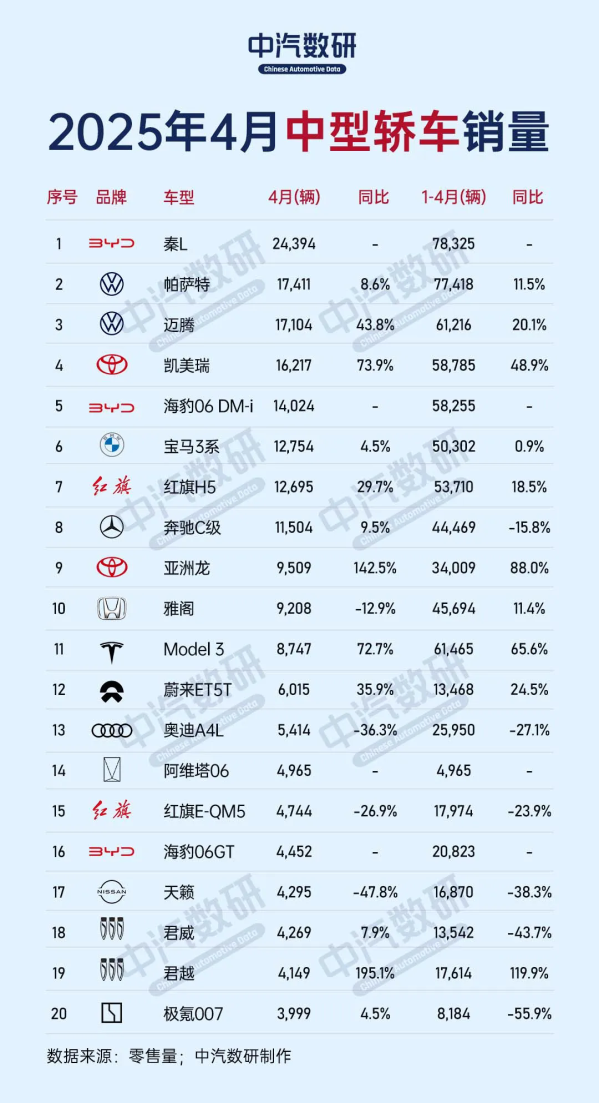 其中,轿车市场销量为82.1万辆,同比增长13.3%,环比下降9.0%。在中型轿车4月销量排名前十的车型中,有8款车型销量突破万辆。比亚迪秦L以2.44万辆的销量蝉联榜首,而特斯拉Model 3则连续两个月销量下滑,4月未能进入前十。