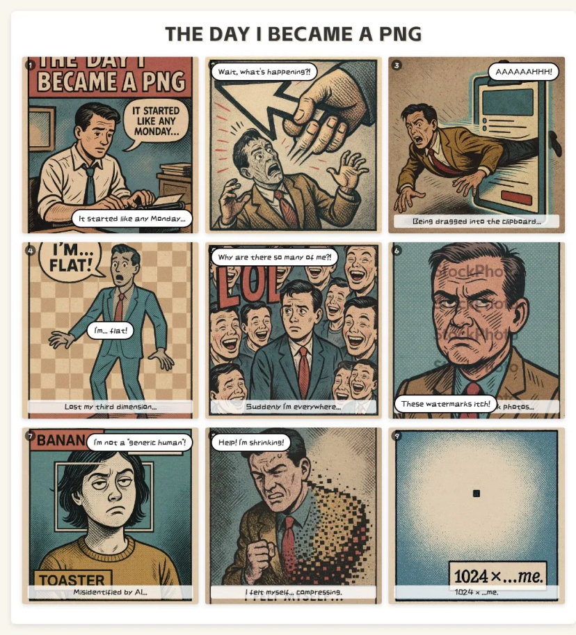The protagonist, after being dragged into a clipboard, loses their third dimension and exists only as a transparent cutout. They get reused in memes, covered by watermarks, misidentified by AI. By the last frame, they shrink into a pixel. Draw in vintage editorial comic style.''