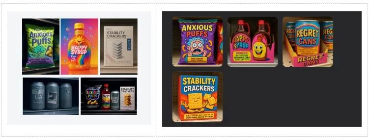 我们测试了一个看似胡闹但实际对图像信息组织要求比较高的项目:设计四种情绪零食包装。