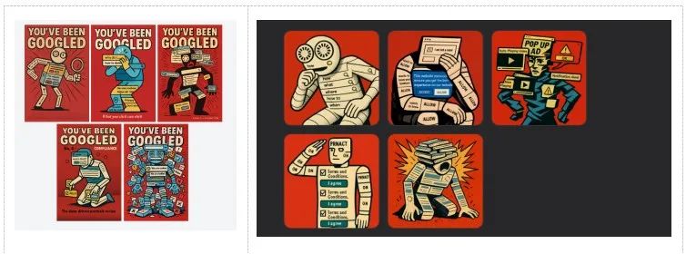 prompt:''Create a 5-poster series titled "You' ve Been Googled."Each visual should depict a different person entirely made out of browser UI elements - search bars, autocomplete text, cookie banners, location prompts,or loading spinners. Every figure should represent a different data-driven emotion (curiosity, shame, distraction,compliance, overload). Use halftone textures, retro red backgrounds, and bold comic composition.''