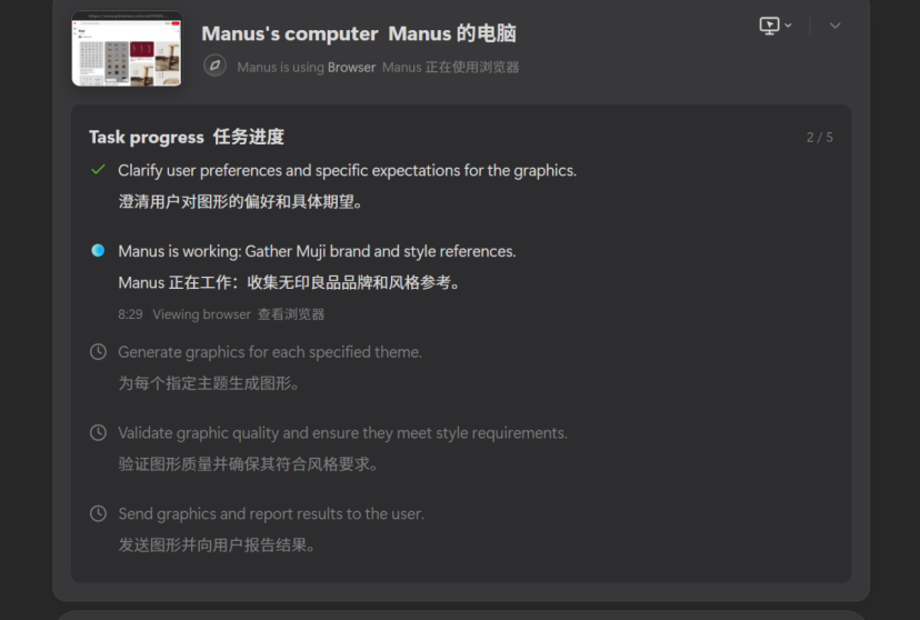向你展示 Manus’s computer 正在做什么,比如它浏览了一下 muji 的官网: