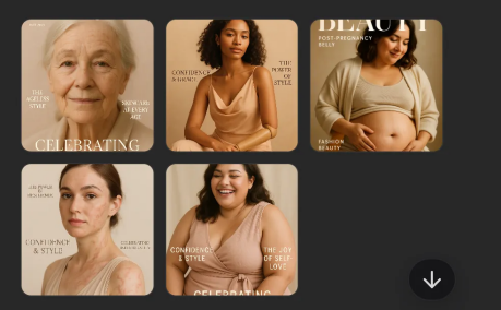 prompt:'' Create 5 fashion/beauty-style covers using bodies that usually aren’t represented in ads: aging skin, disabled limbs, post-pregnancy belly, scars, or fat folds.